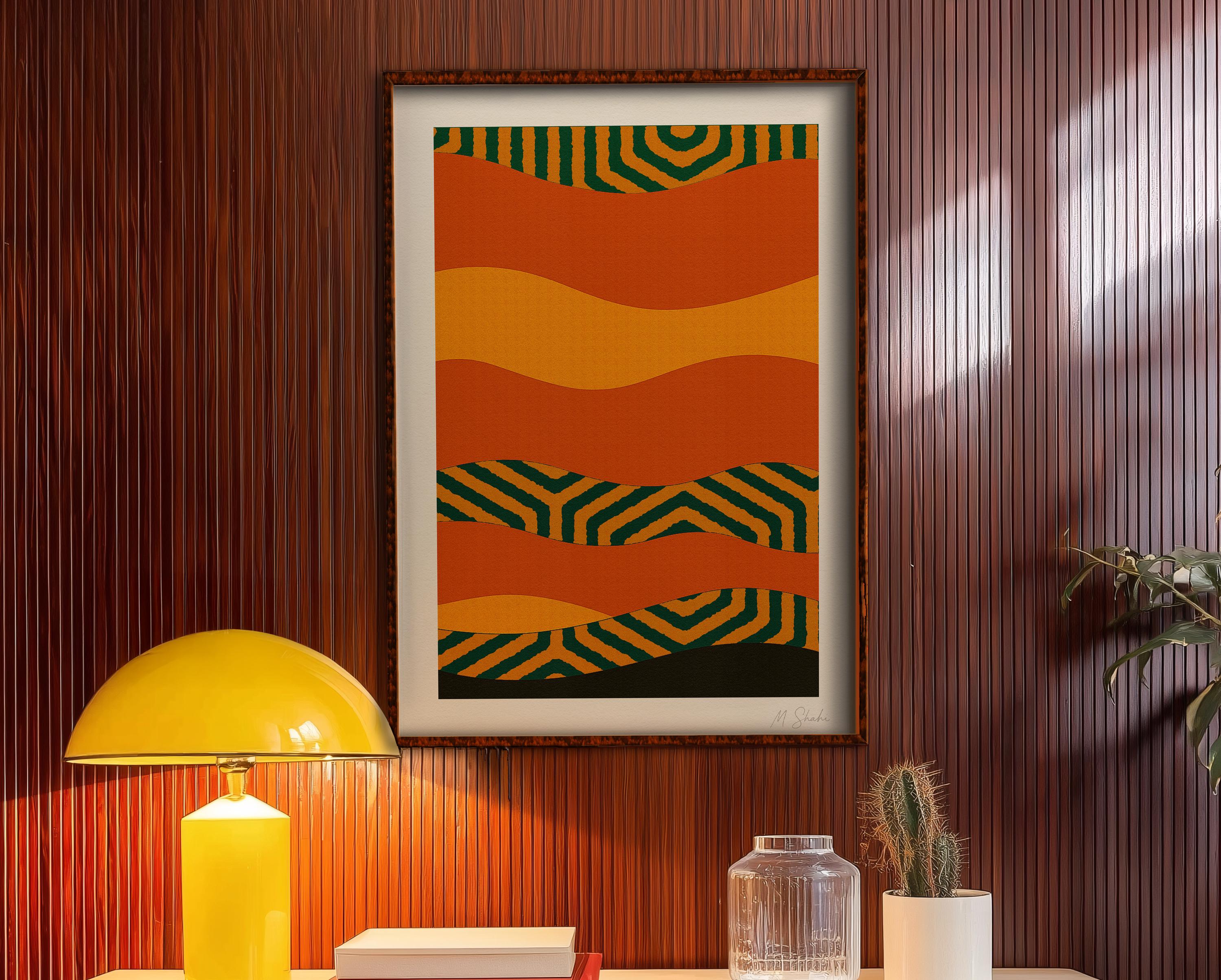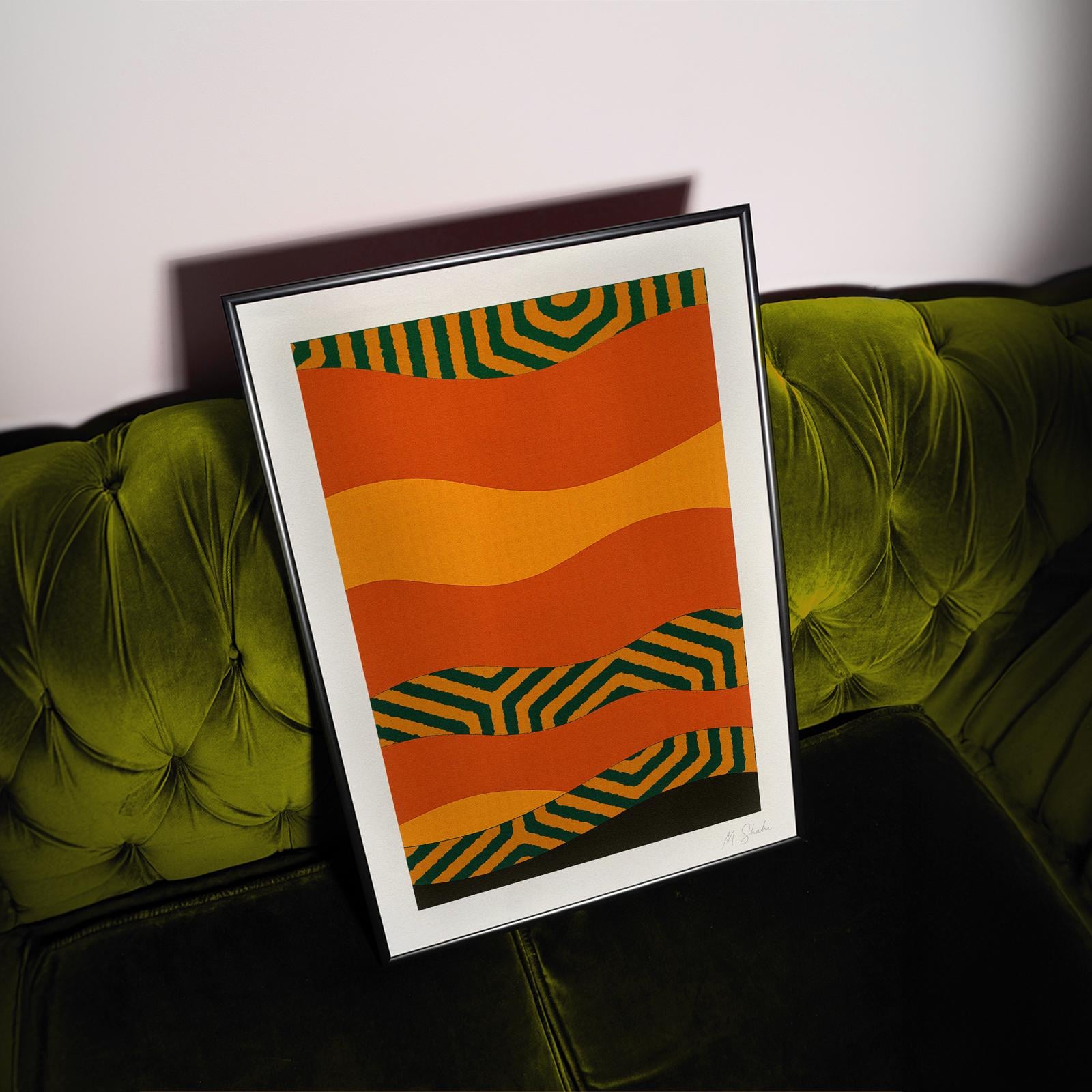 🎨 Immerse yourself in the vibrant energy of mid century modern design with this abstract wall art, featuring bold orange gold waves that dance across the composition. Solar Rhythm II captures a unique curved wave pattern, creating a meditative yet dynamic visual experience perfect for design led interiors seeking warmth and sophistication. Printed on premium Hahnemühle paper, this museum grade print brings texture and depth to your space with every glance.