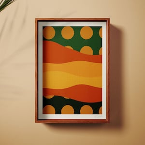 🎨 Experience the harmonious blend of mid century modern design and abstract wall art with this striking Solar Form piece. Inspired by celestial rhythms, the warm ochre disc, rust arc, and navy half-moon create a bold mid century balance that draws you in. Printed on premium giclée print paper, this artwork brings a retro modern style perfect for calm interior decor.